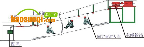 3、  制動可靠,本公司設計生產的繩索運人系統除高速工作制動外,在大于10°坡的系統設末端鉗形閘,制動裝置均為失效安全型,液壓泵站結構先進、安全、可靠。